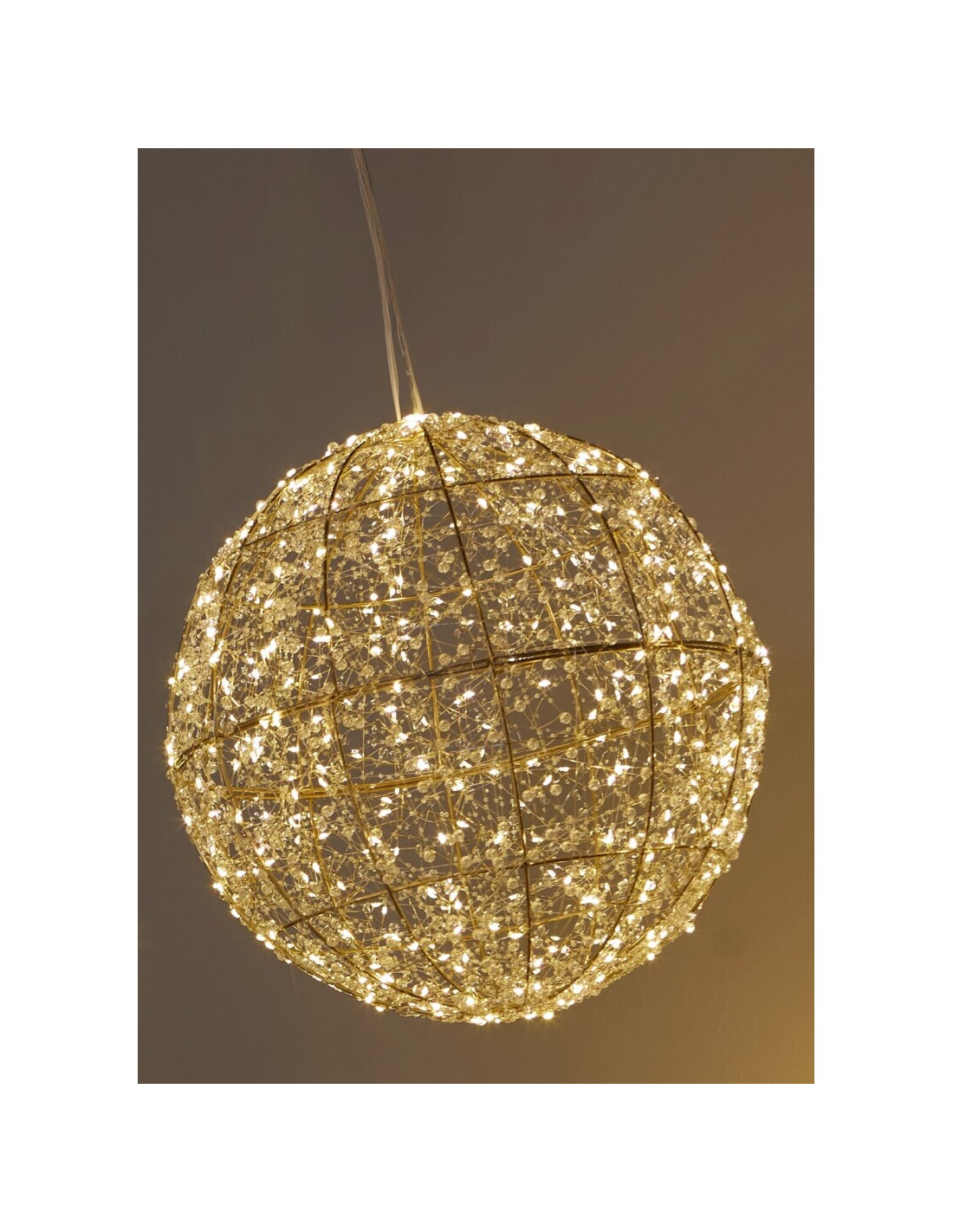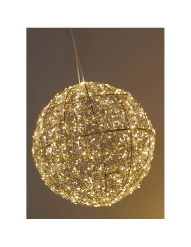 Bola oro perlas 40d cm 600 leds, una esfera dorada de gran tamaño que aporta un efecto luminoso impactante gracias a sus 600 luces LED de tono cálido. Su diseño con estructura metálica recubierta en pvc y acabados perlados brinda un aire sofisticado y decorativo, ideal para eventos, fiestas o como punto focal en la decoración del hogar. Funciona con adaptador de 12V e incluye opción de luz fija o parpadeante, lo que permite variar la ambientación según la ocasión. Con un diámetro de 40 cm, se convierte en un elemento protagonista que llena el espacio con su brillo elegante. Su cable de 5 metros facilita la conexión y el montaje. Resistente para interiores y exteriores gracias a su clasificación IP44, es una opción práctica y estética. Una pieza que no pasa desapercibida.