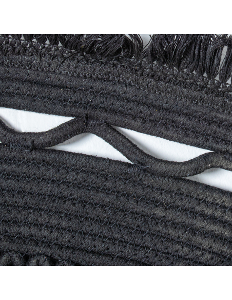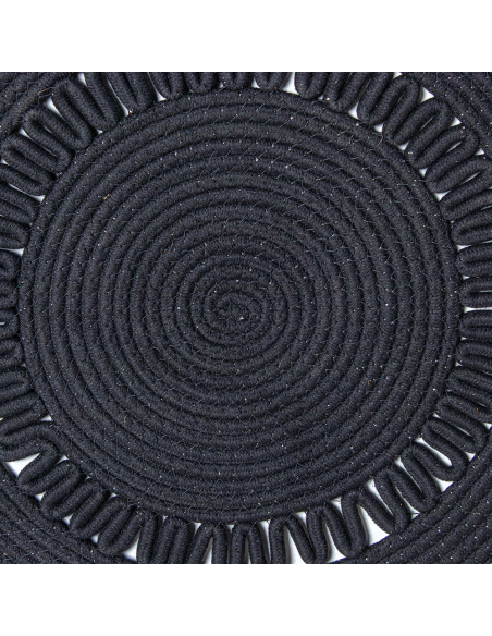 Alfombra círculo mimbre 150 cm negro, confeccionada en fibras naturales, esta alfombra presenta un tejido de color negro con costuras al tono, lo que le da una apariencia elegante y homogénea. Su diseño distintivo incluye una disposición circular con ondas en el centro y flecos en el contorno, aportando una textura única y un estilo decorativo llamativo. Ideal para salones, dormitorios o áreas de estar, esta alfombra no solo embellece tus espacios, sino que también ofrece durabilidad y fácil mantenimiento.