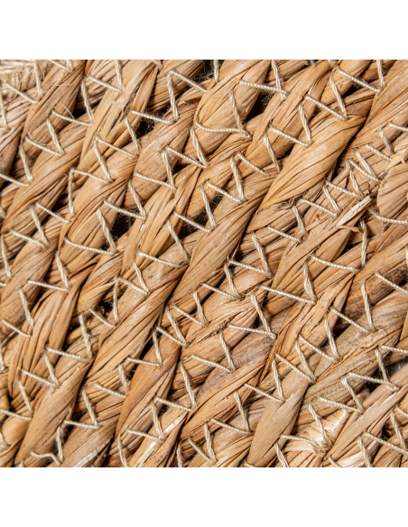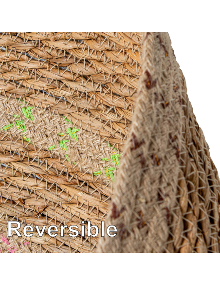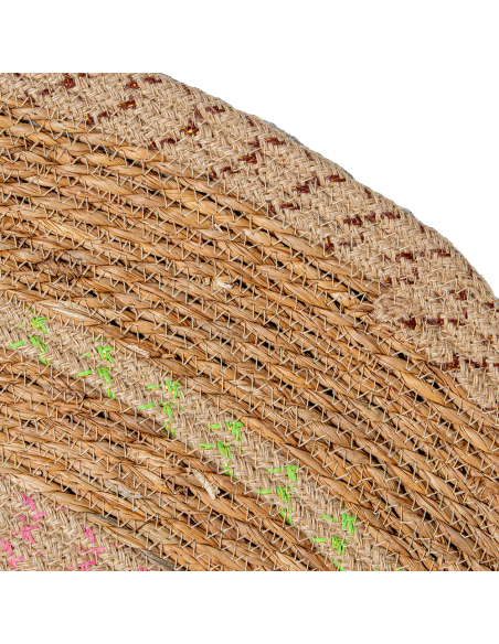 Alfombra espiral mimbre 120 cm natural/verde, confeccionado en fibras naturales, presenta costuras al tono que aseguran una apariencia uniforme y elegante. Su diseño distintivo cuenta con una disposición circular y un intercalado de hilos verdes, negros y rojos, creando un efecto visual único y atractivo. Ideal para salones, dormitorios o áreas de estar, esta alfombra no solo aporta un toque de color y textura a tu hogar, sino que también ofrece durabilidad y fácil mantenimiento.