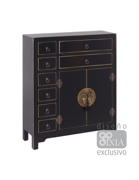 Mueble auxiliar negro detalles bronce para darle a tu hogar un toque diferente con el estilo oriental y contrastar con su color oscuro.