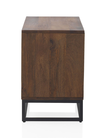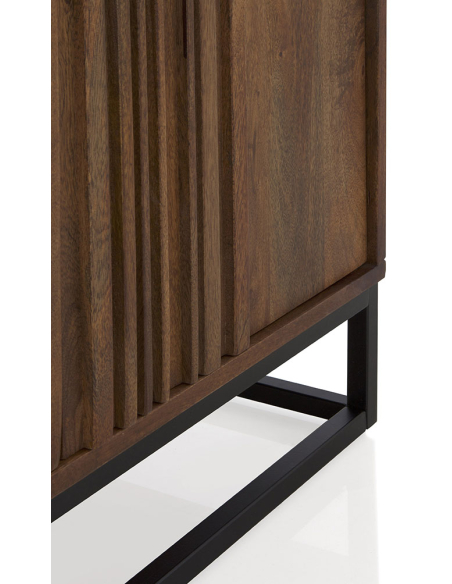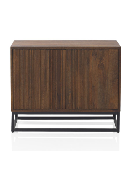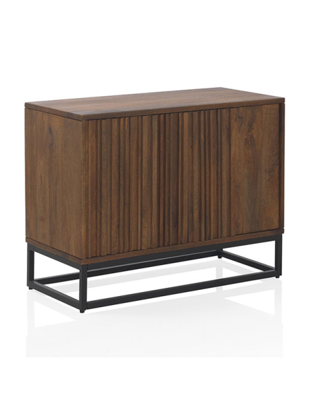 Aparador Eolo pequeño 2 puertas laminadas madera maciza de mango, un mueble compacto diseñado para ofrecer tanto estilo como practicidad en tu espacio. Con dos puertas laminadas de madera maciza de mango, este aparador combina la belleza natural de la madera con la durabilidad y resistencia que garantiza su construcción de alta calidad. Disfruta de la comodidad y la modernidad con el sistema de apertura push, que permite un acceso fácil y sin esfuerzo al contenido almacenado en su interior, sin necesidad de tiradores visibles que interrumpan su estética limpia y minimalista. Además, el frente de las puertas presenta un relieve vertical que añade textura y profundidad visual, creando un punto focal único en cualquier espacio. El interior del aparador está diseñado para una organización eficiente, con un estante a media altura detrás de las puertas que te ofrece espacio adicional para guardar y organizar tus pertenencias según tus necesidades.