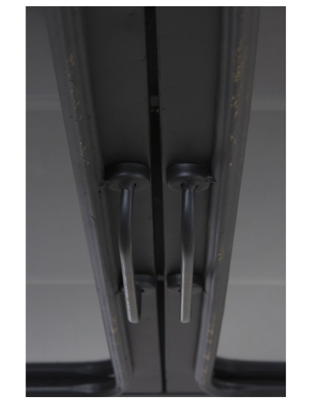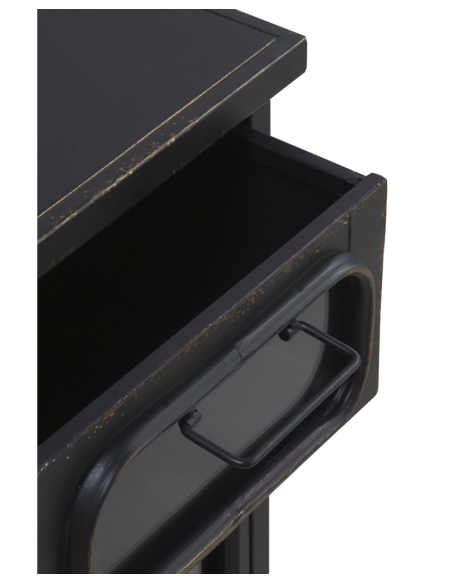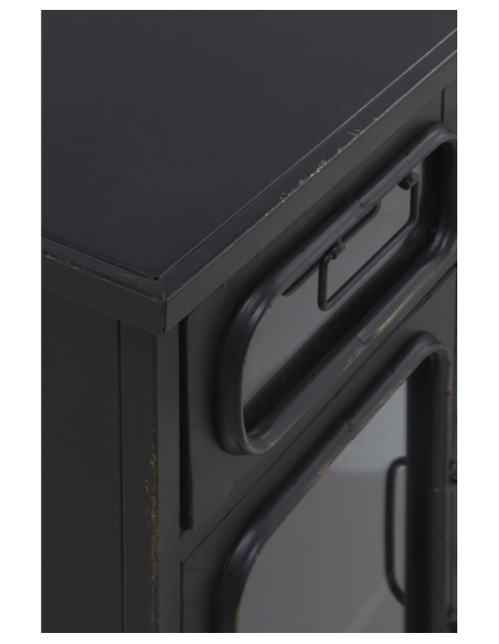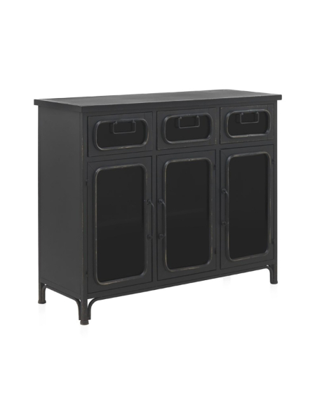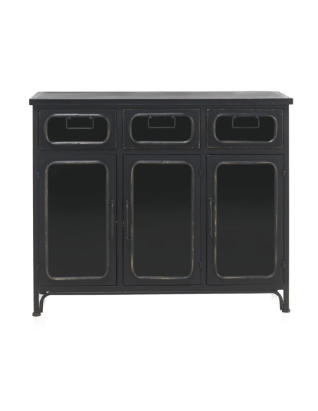 Aparador Tramontana estructura metal, fabricado íntegramente en metal con un acabado negro envejecido, este mueble bajo combina cajones superiores y puertas inferiores (probablemente con interior de cristal o panel metálico) para una organización versátil. Dispone de tres cajones superiores alargados con tiradores tipo etiqueta o tarjetero, evocando los antiguos muebles de archivo. La parte inferior cuenta con tres puertas (una izquierda y dos centrales con balda, según descripción) que ofrecen un amplio espacio para guardar vajilla, botellas u otros objetos. Los detalles de remaches y el acabado desgastado refuerzan su estética fabril. Ideal para comedores, salones o cocinas de estilo industrial, loft o vintage. Este aparador Tramontana no solo es extremadamente funcional y duradero, sino que también aporta una fuerte dosis de personalidad y autenticidad industrial a tu decoración.