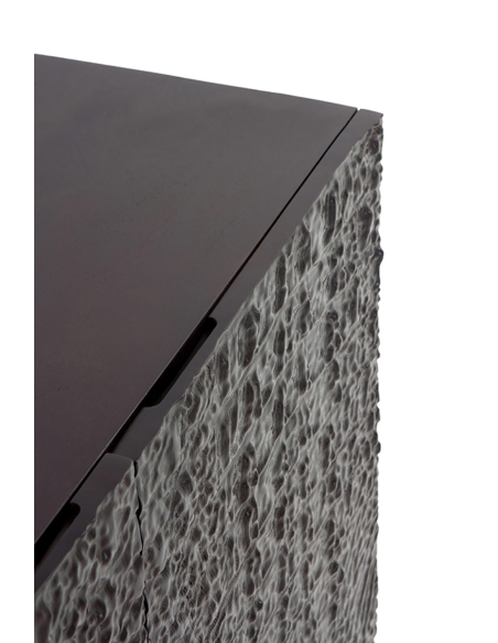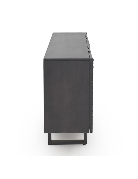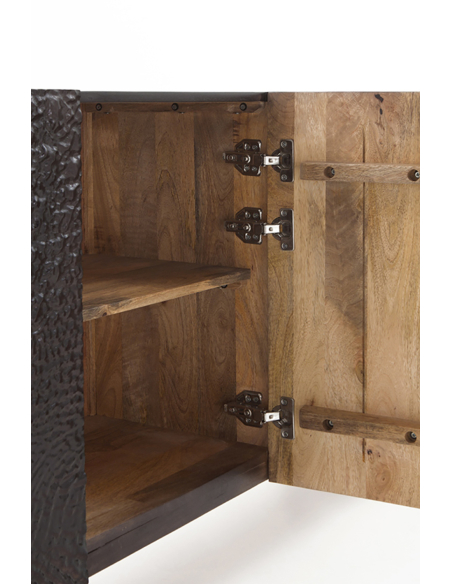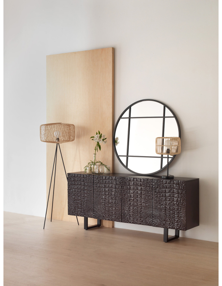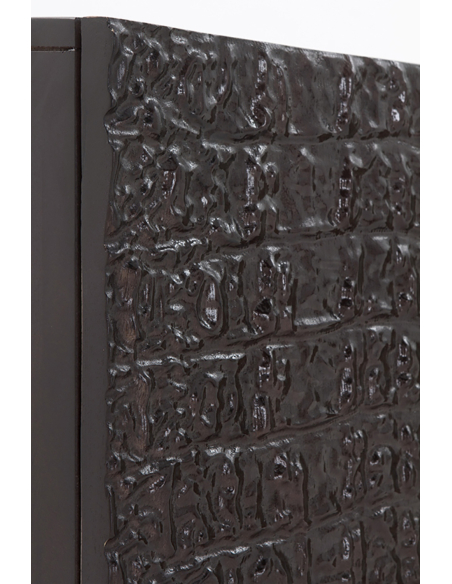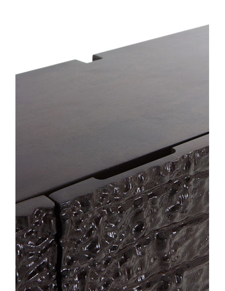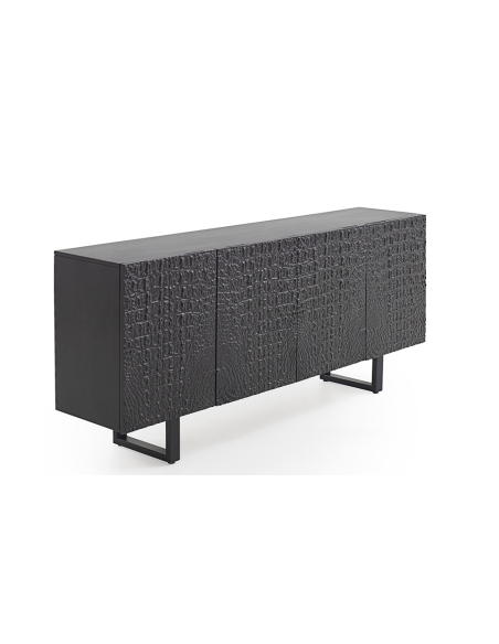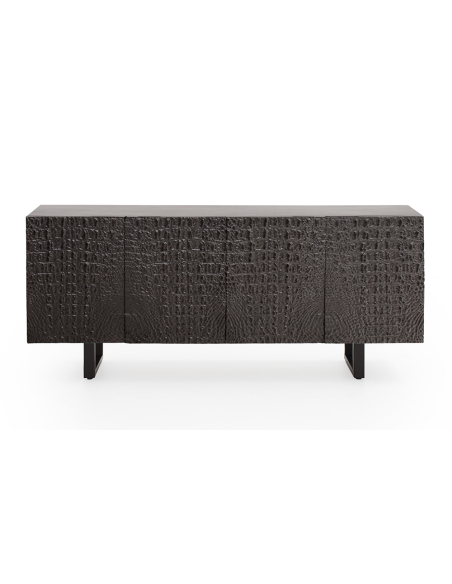 Aparador Orza 4 puertas madera imitación piel coco, este mueble excepcional destaca por sus cuatro puertas frontales revestidas en una impactante imitación de piel de cocodrilo en color negro, con un elegante acabado brillante que captura la luz y las miradas. Fabricado sobre una robusta estructura de madera de mango, este aparador no solo es un deleite visual, sino también una garantía de durabilidad y calidad, perfecto para quienes buscan añadir un toque de lujo y carácter a su decoración. Detrás de sus texturizadas puertas, el aparador Orza ofrece un espacio de almacenamiento práctico y bien distribuido. Un estante interior a media altura recorre el mueble, permitiendo organizar vajilla, cristalería, mantelería o cualquier otro objeto que desees mantener ordenado y fuera de la vista. Las patas metálicas en color negro proporcionan una base estable y complementan el diseño moderno y lujoso del conjunto, elevando la pieza y facilitando la limpieza del espacio inferior. Ideal para presidir el salón, el comedor o incluso un recibidor amplio, el Aparador Orco se convierte en el foco de atención de cualquier estancia. Su diseño único, que combina la textura exótica con líneas limpias y un acabado brillante, lo hace perfecto para interiores contemporáneos, modernos o de estilo glam. Aporta personalidad, almacenaje y un toque de exclusividad a tu hogar con esta pieza inolvidable.