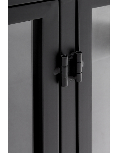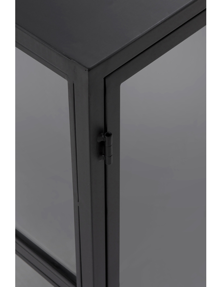 Aparador Brisa puertas y laterales de cristal, esta pieza combina una estructura metálica en negro mate con tres puertas frontales y laterales acristalados, junto a una sección lateral abierta con dos estantes fijos. Esta configuración mixta ofrece tanto almacenaje protegido como espacio de exposición abierto. Ideal para el comedor o el salón, la parte acristalada, con dos estantes interiores (4 niveles en total contando la base y el superior implícito en la estructura), es perfecta para guardar vajilla o cristalería, mientras que la sección abierta permite tener a mano libros, objetos decorativos o bandejas. El contraste entre zonas cerradas y abiertas le da dinamismo y funcionalidad. Este aparador bajo es una solución de almacenaje versátil y con mucho estilo. Su estética industrial, marcada por el metal negro y el cristal, aporta carácter y modernidad, convirtiéndose en una pieza funcional y decorativa que no pasará desapercibida.