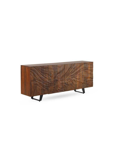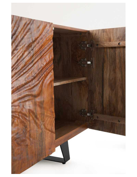Aparador Jaspe 4 puertas, combina la calidez de la madera maciza de mango natural con la elegancia de los pies metálicos negros en forma de U con regulador de altura, logrando un equilibrio perfecto entre diseño y funcionalidad. Sus cuatro puertas con cierre suave y sistema de imán aseguran un acceso fácil y seguro a tus objetos, mientras que el frente texturizado con relieve de fantasía aporta un toque sofisticado y contemporáneo. Ideal para almacenar vajilla, libros o elementos decorativos, este aparador se convierte en una pieza central que transforma cualquier espacio en un hogar elegante y acogedor.