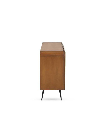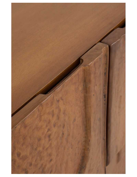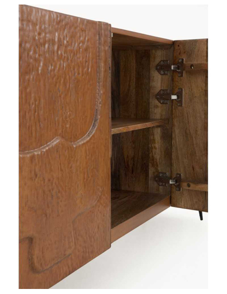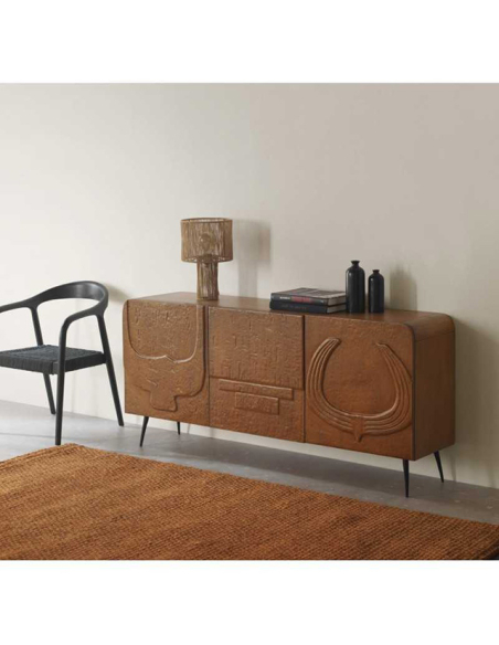 Aparador Símbolos 3 puertas, con un diseño cálido y sofisticado que combina la madera natural con pies metálicos negros de 18 cm, regulables para mayor estabilidad. Su frente texturizado con relieve de fantasía aporta un toque artesanal y exclusivo, mientras que las puertas independientes con bisagras de cierre suave e imán garantizan un uso silencioso y seguro. Las esquinas ligeramente redondeadas y el estilo contemporáneo hacen que este aparador sea perfecto para cualquier ambiente, ofreciendo un amplio espacio para mantener tus objetos organizados con elegancia.