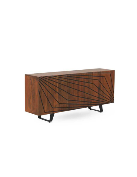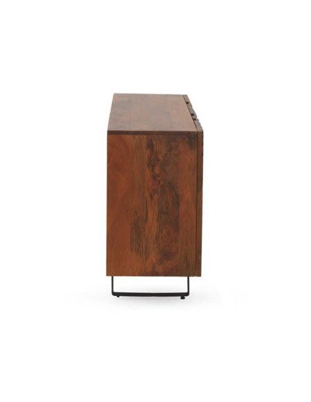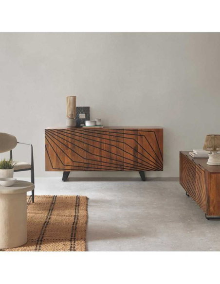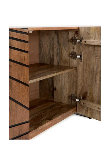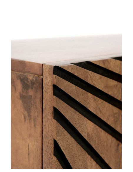 Aparador Nácar 3 puertas, fabricado con madera maciza de mango con un frente tallado en líneas geométricas que aporta estilo y modernidad a cualquier ambiente. Sus 3 puertas independientes cuentan con bisagras de cierre suave e imán de seguridad, ofreciendo almacenamiento seguro y ordenado para tu hogar. Los pies metálicos en forma de U de 15 cm en color negro con regulador de altura combinan estabilidad con un diseño contemporáneo, creando un mueble funcional y sofisticado que se integra perfectamente en salones, comedores o espacios de estilo moderno y elegante.