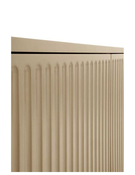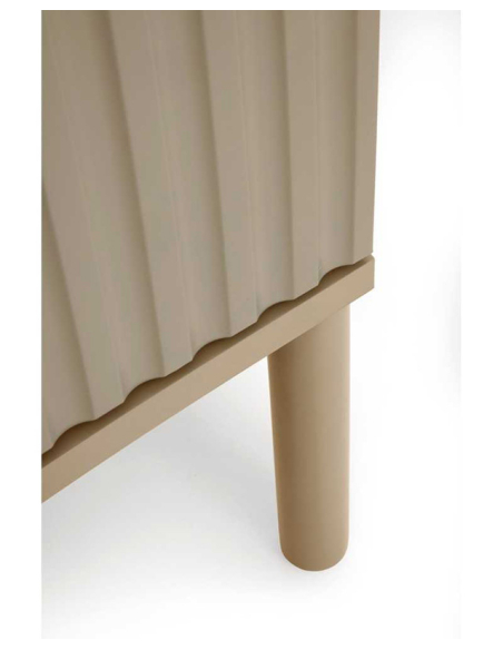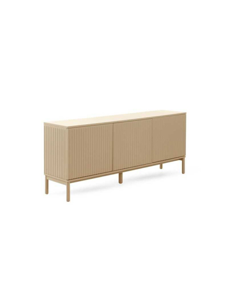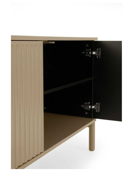 Aparador Ópalo ranuras beige, combina diseño moderno y funcionalidad, ideal para cualquier ambiente de tu hogar. Su frente de 3 puertas con ranuras acanaladas y laterales decorativos aportan un toque elegante y contemporáneo. Gracias al sistema push to open, podrás abrir las puertas sin necesidad de tiradores, mientras que las bisagras de cierre amortiguado suave aseguran un funcionamiento seguro y silencioso. El interior incluye un estante movible con tres posiciones de altura, perfecto para organizar vajilla, libros u objetos decorativos. Las patas de madera maciza de 20 cm aportan estabilidad y armonía, completando un mueble práctico y estilizado que transforma tu espacio.
