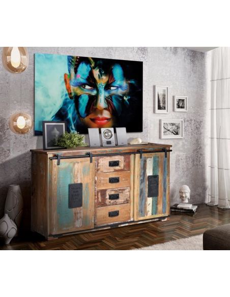 Te presentamos un mobiliario fabricado en madera reciclada y de estilo vintage para que llenes tu hogar de color y armonía. Este aparador vintage es una de las piezas que puedes encontrar en la colección. Es perfecto para ponerla en tu dormitorio, en el salón o en el comedor. Tiene cuatro cajones en la parte central y dos armarios altos a los lados con las puertas correderas. Te cabrán cantidad de cosas dadas sus dimensiones. Puedes guardar tu ropa en los cajones y zapatos en los armarios, o al revés, tú decides. Las puertas, al ser correderas, no ocuparán sitio al tenerlas abiertas. La desventaja es que no podrás tener abiertos los cajones y el armario al mismo tiempo, aunque no es un impedimento. Es un diseño moderno con un toque antiguo y colores sacados como si estuviera desgastado para darle el estilo vintage. Los tiradores son de estilo tradicional, de forja y sencillos en los cajones. En este aparador vintage podrás colocar también, en la parte superior tu cadena de música o figuras, pero también puedes dejar tus perfumes, lámparas o centros, aunque también le irá perfectamente un jarrón, portafotos o cualquier figura de decoración. Además, si no tienes nada en la pared te recomendamos un buen cuadro o un espejo para llenar y completar la estancia y hacerla más amplia también.