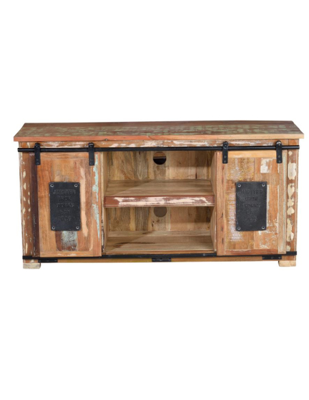 Te presentamos un mobiliario fabricado en madera reciclada y de estilo vintage para que llenes tu hogar de color y armonía. Este mueble vintage es una de las piezas que puedes encontrar en la colección. Es perfecto para ponerla en tu dormitorio, en el salón o en el comedor. Tiene dos baldas en la parte central y dos armarios altos a los lados con las puertas correderas. Te cabrán cantidad de cosas dadas sus dimensiones. Puedes guardar tus zapatos tanto en las baldas como en los armarios, tú decides. Las puertas, al ser correderas, no ocuparán sitio al tenerlas abiertas. Es un diseño moderno con un toque antiguo y colores sacados como si estuviera desgastado para darle el estilo vintage. No tiene tiradores, lo que hace que sea más sencillo y más fácil de manipular. En este mueble vintage podrás colocar también, en la parte superior tu cadena de música o figuras, pero también puedes dejar tus perfumes, lámparas o centros, aunque también le irá perfectamente un jarrón, portafotos o cualquier figura de decoración. Además, si no tienes nada en la pared te recomendamos un buen cuadro o un espejo para llenar y completar la estancia y hacerla más amplia también. Por su distribución nos puede servir de mueble TV, si nos gusta la mesa un poco alta.