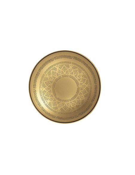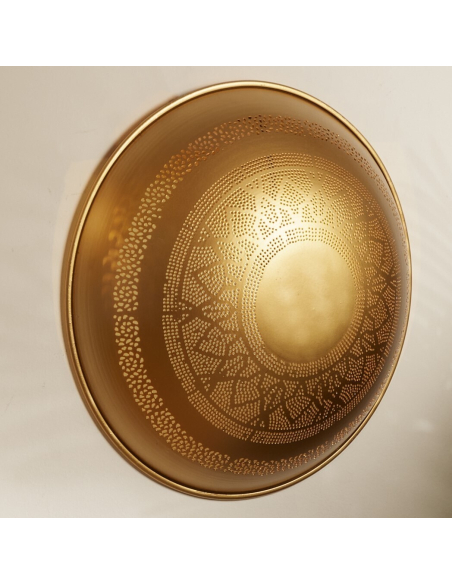 Aplique Dagmar oro 42 cm. Decora e ilumina tus paredes con el aplique Dagmar. De forma circular y en metal color oro, este aplique cuenta con pequeñas perforaciones que dejan pasar la luz de una forma muy especial.
