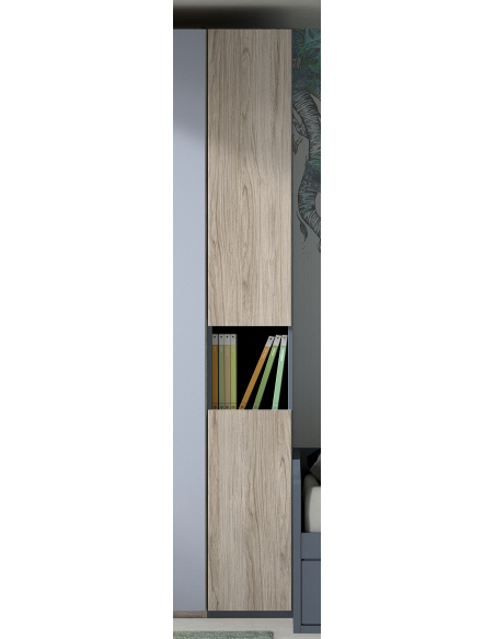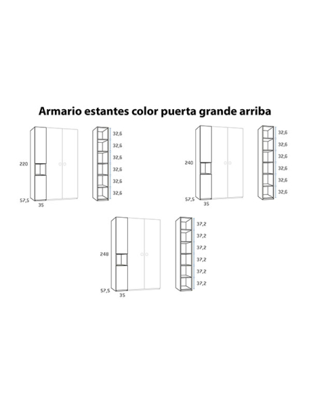 Armario juvenil estantes color puerta grande arriba, disponible en medida de 35 cm y tres alturas, 220, 240 y 260 cm, combinables entre sí. Echa un vistazo a los acabados para las puertas y combínalo con el acabado que más te guste.