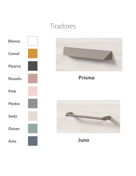 Posibilidad de elegir entre diferentes colores base para la estructura del armario, cualquier acabado de la carta para las puertas y dos modelos de tirador en cualquier acabado liso.