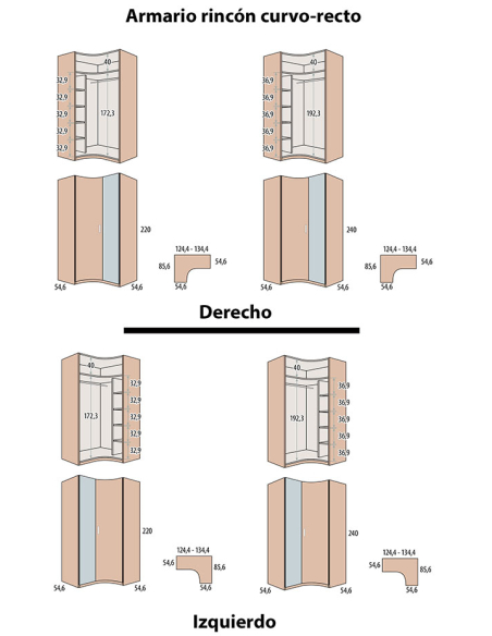 Armarios de 220 cm de alto, montaje tumbado 230 cm, montaje de pie 222 cm.