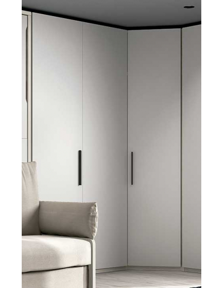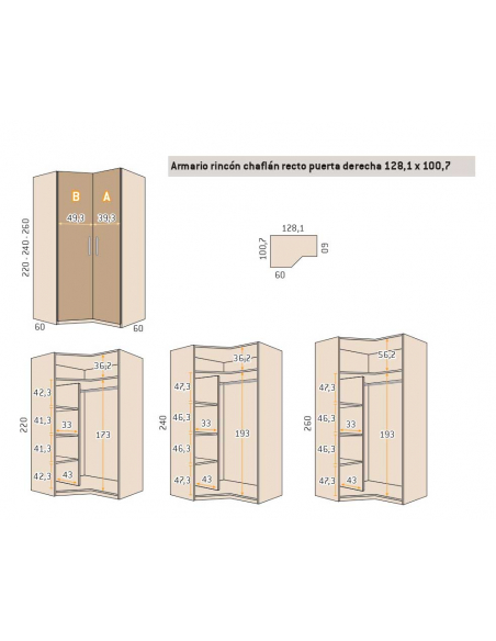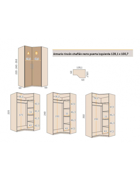 Armario rincón chaflán recto de 128,1 x 100,7 cm y disponible a izquierda o derecha. Posibilidad de tres alturas 220, 240 o 260 cm de pendiendo de la altura disponible. Una manera práctica de aprovechar todo el espacio de la habitación.
