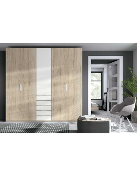 ¿Tienes un espacio pequeño en la habitación y necesitas almacenar y organizar tus cosas? Con este armario de una puerta más cinco cajones conseguirás tener todo en orden y organizado. El interior es un módulo con dos huecos en el caso de los armarios con 220 cm de alto y tres huecos en las medidas de 240 y 260 cm. Un imprescindible en las habitaciones tanto a nivel organizativo como compositivo. Cajones con autofreno.