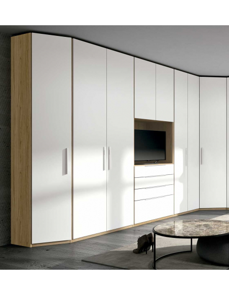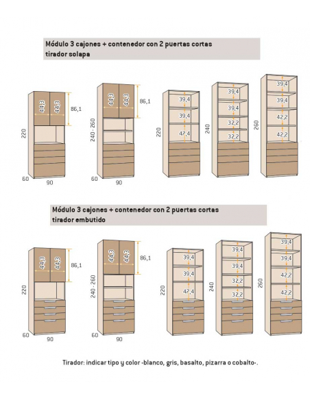 Armario recto dos puertas, hueco en parte central, tres cajones más contenedor en la parte inferior, disponible tres alturas desde 220 cm. Echa un vistazo a los acabados para las puertas y combínalo con el tirador que más te guste.