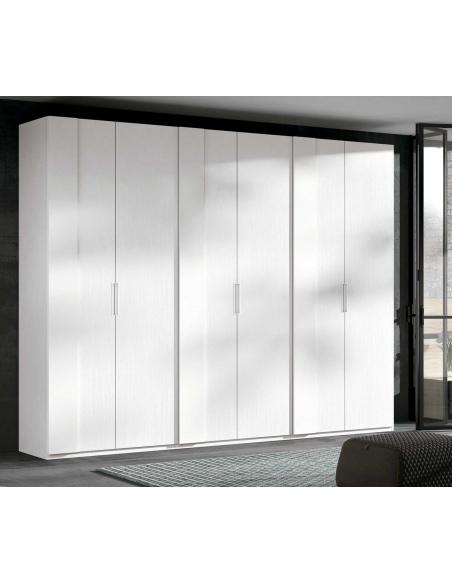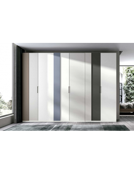 Armario recto Kúbica cinco puertas batientes, disponible en siete anchuras diferentes a partir de 208,80 cm, y tres alturas desde 220 cm, combinables entre sí. Echa un vistazo a los acabados para las puertas y combínalo con el tirador que más te guste.