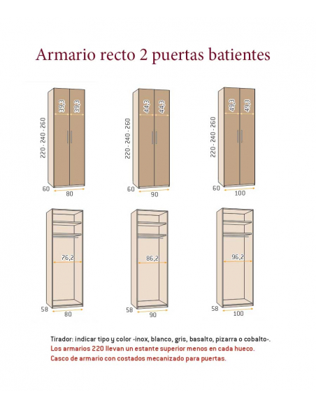 Armario recto dos puertas batientes, disponible en tres anchuras diferentes a partir de 80 cm, y tres alturas desde 220 cm, combinables entre sí. Echa un vistazo a los acabados para las puertas y combínalo con el tirador que más te guste.