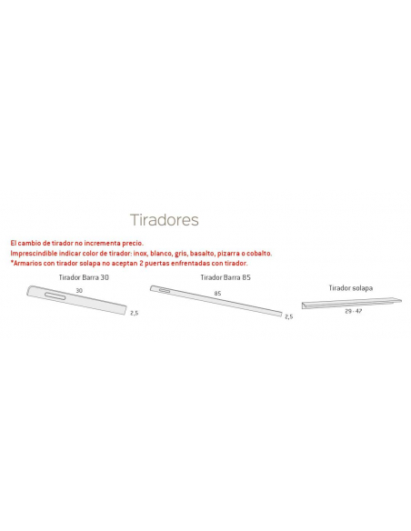 Tipos de tirador: tirador barra 30 cm / tirador barra 85 cm / tirador solapa de 29 o 47 cm / tirador embutido de 17 o 24 cm