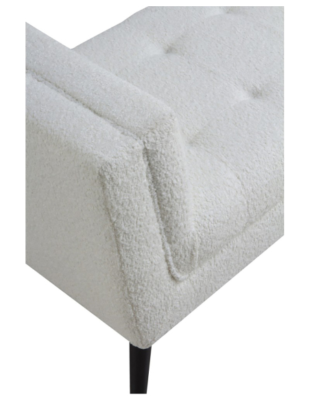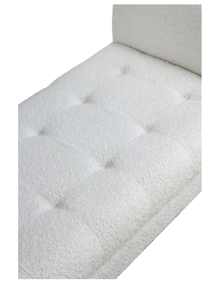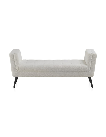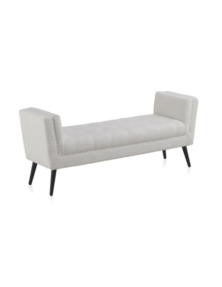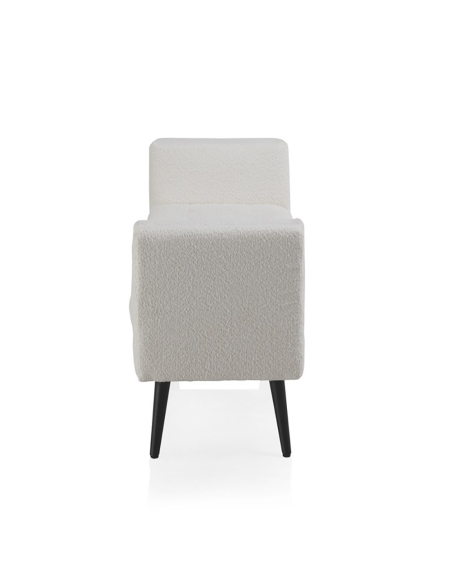 Banqueta descalzador tapizada blanca con borde, tapizada en un luminoso tejido bouclé blanco, su diseño se distingue por los bordes laterales elevados que actúan como discretos reposabrazos, aportando estructura y confort. Un sutil capitoné lineal puede adornar el asiento, añadiendo textura. Apoyada sobre finas patas cónicas de madera negra, esta banqueta combina la suavidad del bouclé con líneas modernas y ligeras. Es perfecta como asiento principal a los pies de una cama, como un elegante banco en el recibidor o como una pieza sofisticada en el salón, ofreciendo un asiento cómodo y con estilo. Si buscas una pieza que combine confort, textura de tendencia y un diseño depurado, esta banqueta es ideal. Su acabado en bouclé blanco aporta luminosidad y se integra fácilmente en decoraciones nórdicas, modernas o minimalistas. (Requiere montaje de patas muy sencillo).
