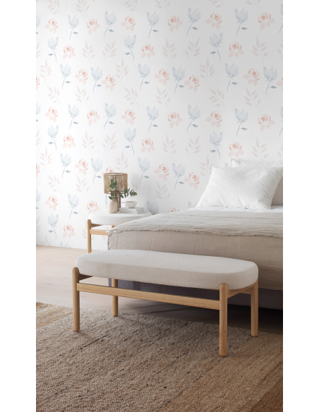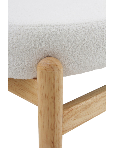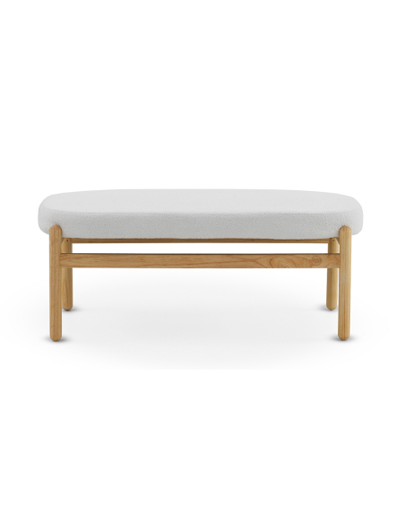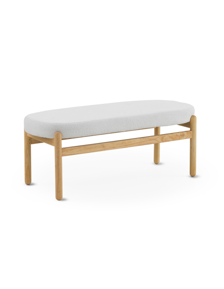 Banqueta Ola descalzador tapizada en bouclé blanco, este elegante banco presenta un asiento alargado de forma ovalada, generosamente acolchado y tapizado en tejido bouclé blanco, que descansa sobre una sólida y visible estructura de madera maciza de pino en acabado natural. La combinación del blanco luminoso y la madera clara crea una estética fresca y acogedora. Perfecta para colocar a los pies de la cama y facilitar la tarea de vestirse o descalzarse, o como un asiento práctico y estiloso en la entrada de casa. Su diseño minimalista y sus materiales naturales la convierten en una pieza atemporal que complementa decoraciones escandinavas, modernas o minimalistas. Disfruta de su diseño y utilidad inmediatamente, ya que esta banqueta Ola se entrega lista para usar, sin necesidad de montaje. Es una opción ideal para quienes buscan añadir un asiento funcional con un diseño limpio, materiales de calidad y la calidez característica del estilo nórdico.