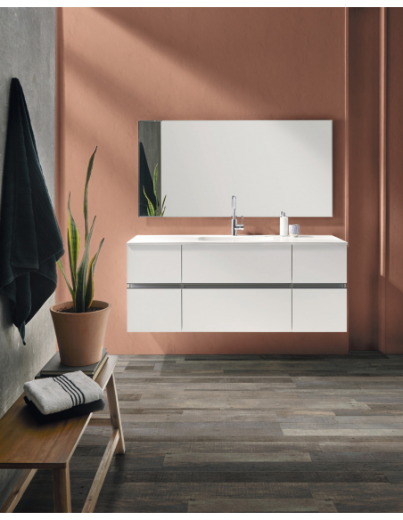 Mueble de baño personalizable. Está compuesto por tres módulos de cajones disponible en ocho colores diferentes, lavabo integrado en encimera Solid Surface y espejo canto pulido.