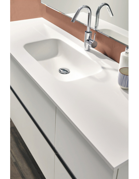 Módulo de 180 cm acabado en color Blanco con encimera Solid Surface y lavabo centrado. Espejo canto pulido.