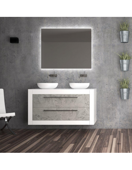 Composición de baño compuesta por mueble de baño con marco perimetral de 8 cm con dos cajones, encimera con doble lavabo de piedra y espejo retroiluminado a juego.