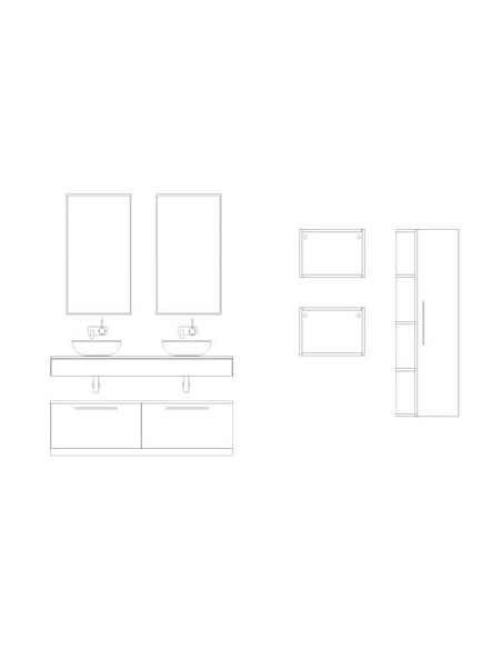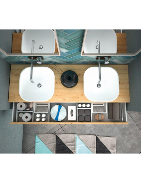 Composición de baño Klasic doble sobrepuesto 140 cm compuesto por encimera con dos lavabos sobrepuestos con cajón integrado, dos espejos, una bancada de dos cajones, una repisa, columna auxiliar y dos huecos decorativos.