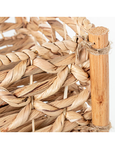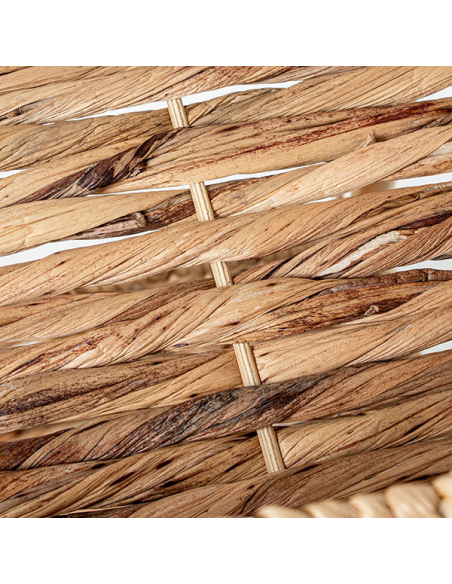 Estante almacenaje 2 cestos jacinto de agua con patas madera, esta pieza combina a la perfección los elementos naturales, compuesto por 2 cestos tejidos acompañados de cuatro varillas de madera en los extremos. La fusión de materiales naturales y un diseño funcional proporciona un lugar perfecto para guardar tus objetos mientras añade un toque rústico y acogedor. Las patas de madera garantizan estabilidad, convirtiéndolo en una pieza práctica y estéticamente agradable.