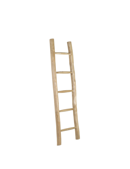 Toallero escalera madera natural, perfecta para aportar estilo y funcionalidad a tu hogar. Ideal para colgar toallas en el baño o mantener las mantas organizadas en el salón, su estructura robusta de cinco peldaños está fabricada en madera natural de color claro con un acabado lustroso que realza la belleza de su veta. Este elemento decorativo se adapta fácilmente a distintos espacios, combinando su diseño rústico con un toque de modernidad.