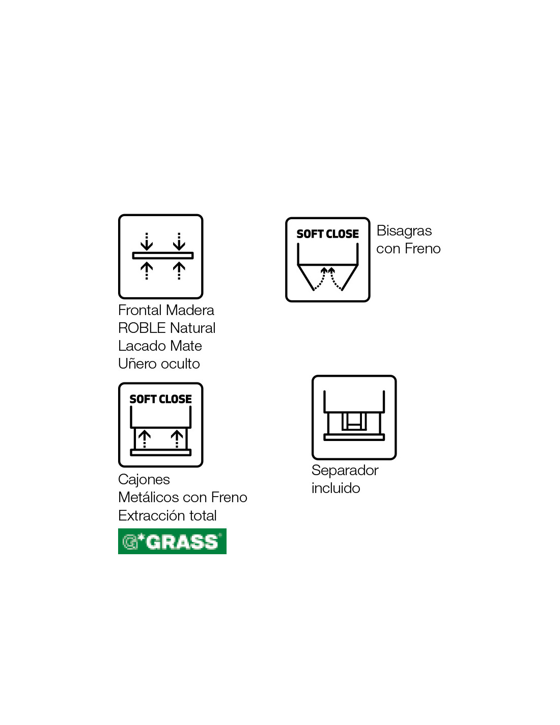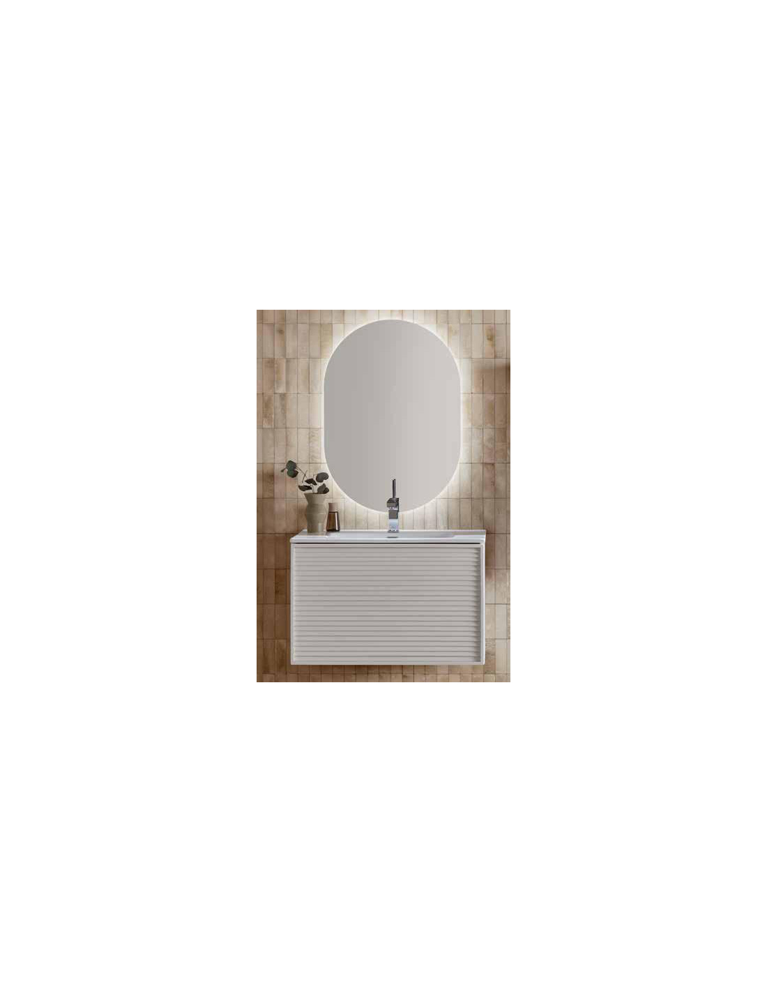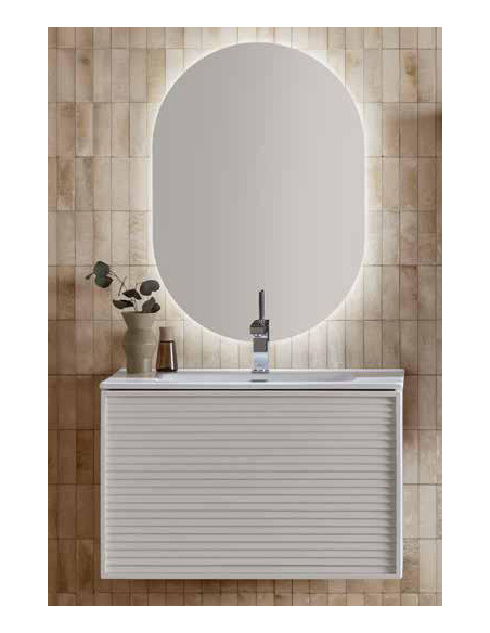 Mueble de baño Zenit un cajón con lavabo encimera cerámica. Espejo retroiluminado Led opcional. Frontal madera roble natural lacado mate con uñero oculto. Cajones metálicos con freno y extracción total, separador incluido.
