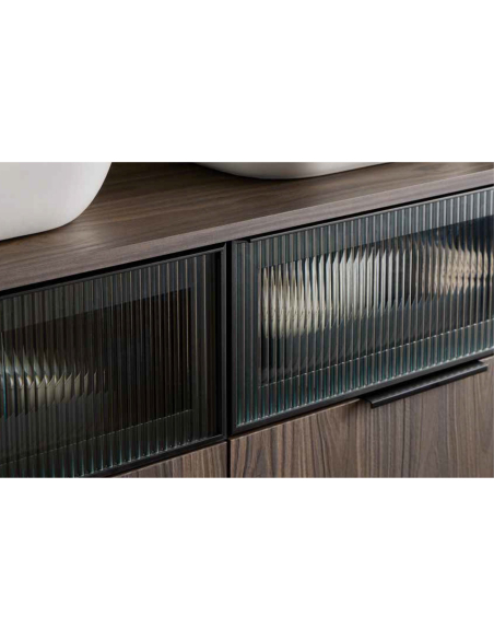Mueble de baño Mirko de 120 cm con dos módulos de 2 cajones con tapa textura, dos lavabos sobre encimera y dos espejos retroiluminados LED. Un mueble con el frente del cajón superior de cristal rayado lo que le confiere modernidad y elegancia. Frontal Marco aluminio negro mate con tirador integrado. Cajones metálicos con freno y extracción total, separador incluido.