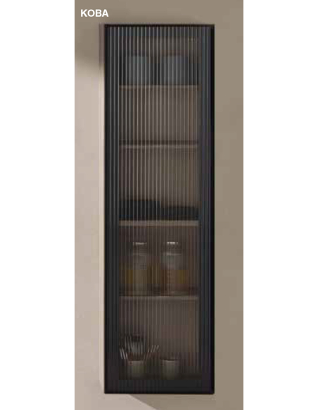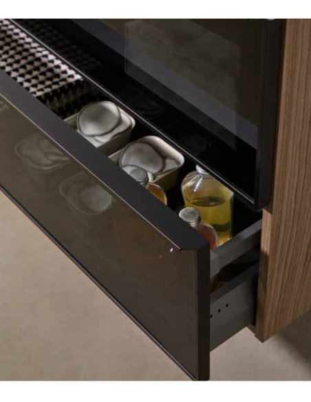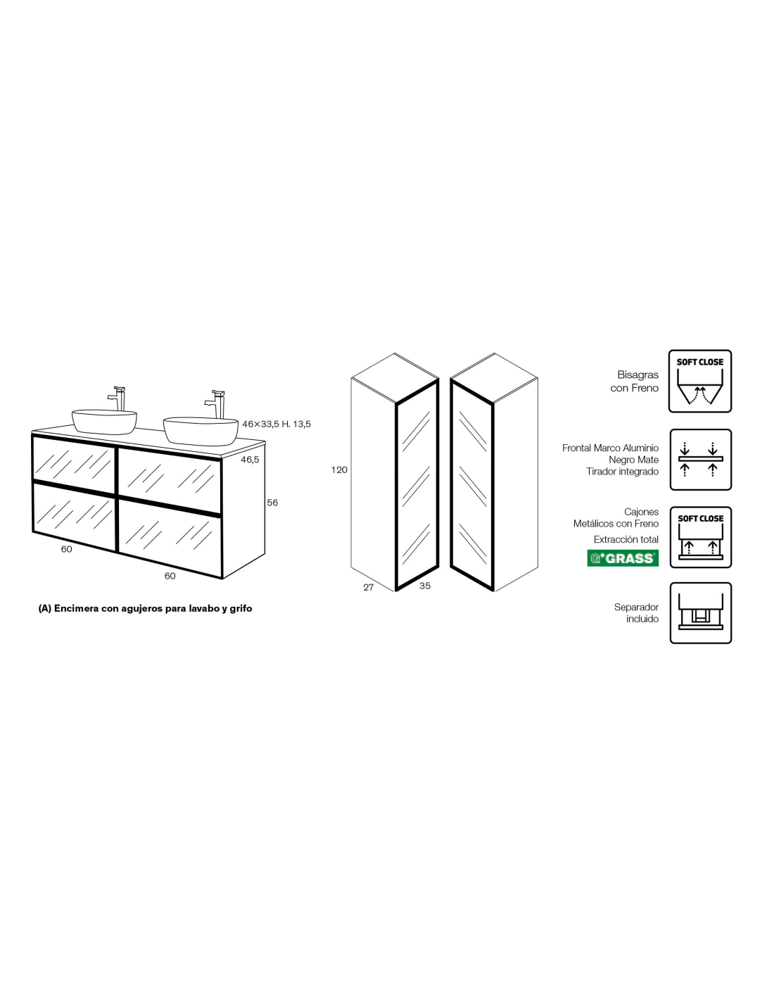 Mueble de baño Koba de 120 cm con dos módulos de 2 cajones con tapa encimera textura con lavabos sobre encimera, espejo con borde lacado y dos columnas auxiliares a pared. Marco aluminio con tirador negro mate y cristal en dos opciones: cristal rayas o cristal parsol negro. Frontal marco aluminio negro mate con tirador integrado. Cajones metálicos con freno y extracción total, separador incluido.