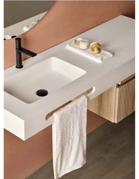 Mueble de baño Etna de 180 cm con encimera Solid Blanco Mate con lavabo integrado y toallero con 1 espejo redondo retroiluminado LED. Un conjunto ideal para el baño que confiere elegancia a la vez que funcionalidad y de plena actualidad con el frente alistonado.