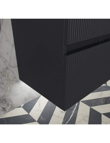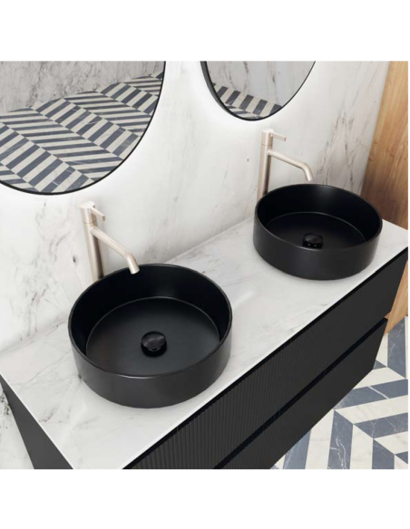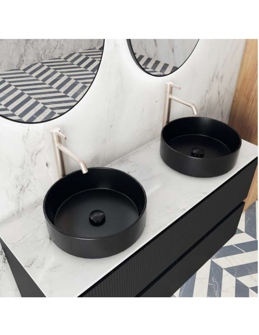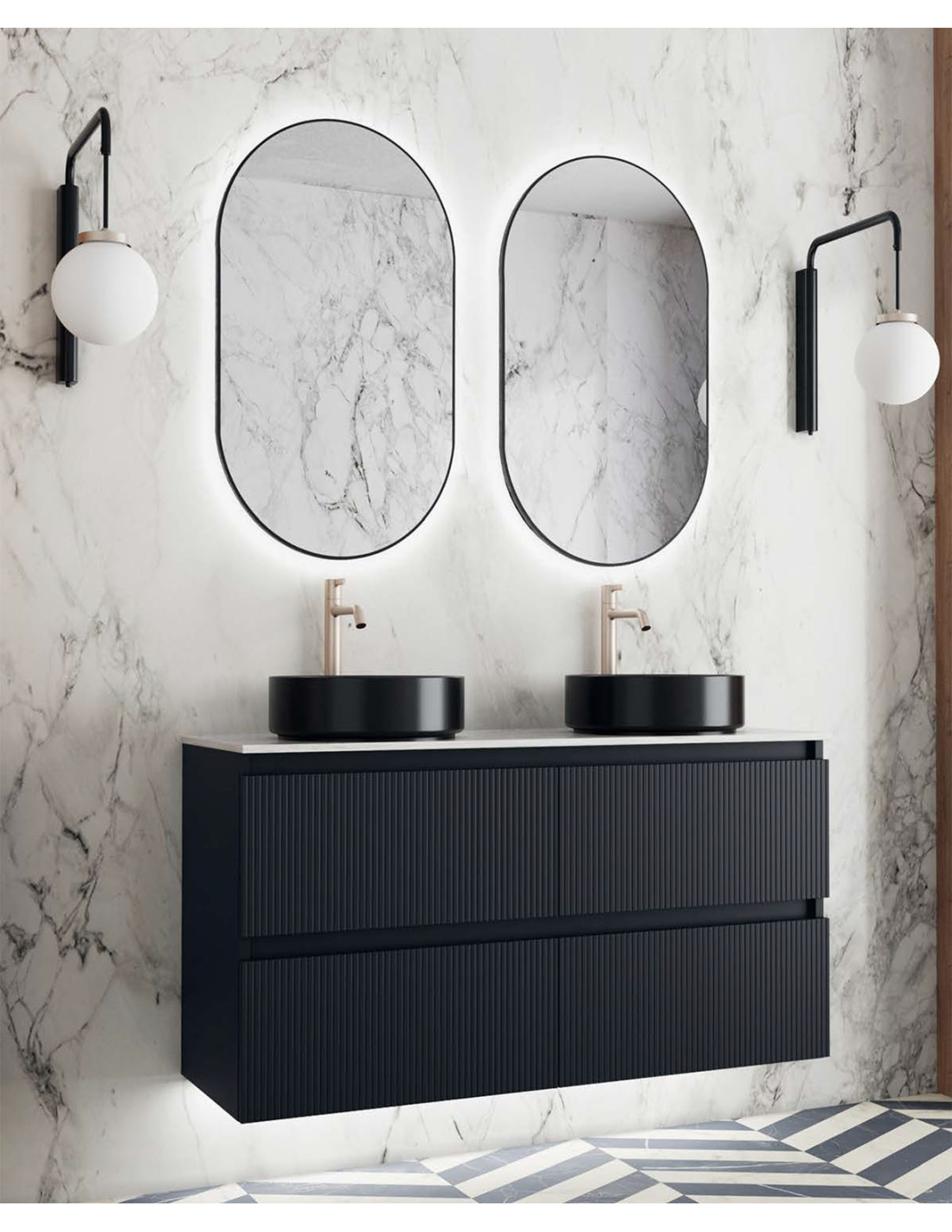 Frente Soul Laca. Tapa piedra mármol calacatta. Lavabo negro mate.