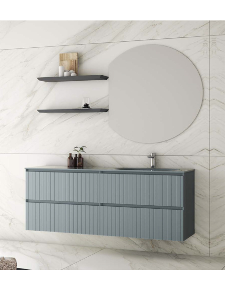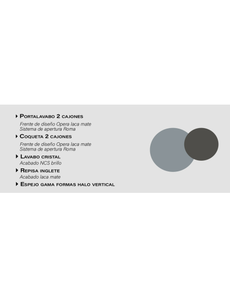 Composición de baño Opera Inglete 4 cajones de 140 cm, compuesta por dos muebles porta lavabo dos cajones de 70 cm con el frente diseño Opera Inglete, encimera lavabo de cristal desplazado, dos repisas y espejo Halo Vertical. Una composición elegante y moderna con la que amueblar el baño y disfrutar cada día.