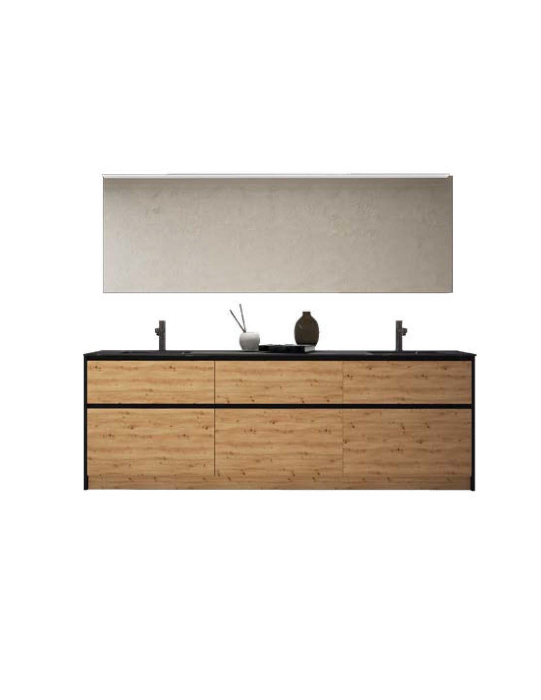 Composición de baño 180 cm doble lavabo conjunto 08, compuesta por tres muebles porta lavabo 2 cajones de 60 cm con zócalo, doble lavabo Dumi y espejo Rectangle. Una composición elegante y moderna con la que amueblar el baño y disfrutar cada día.