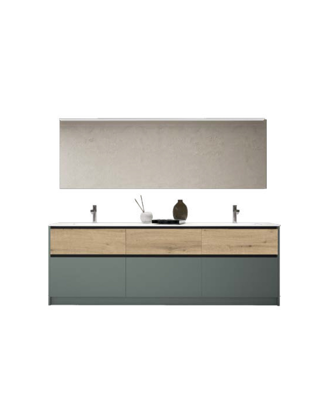 Composición de baño 180 cm doble lavabo conjunto 08-03, compuesta por tres muebles porta lavabo 2 cajones de 60 cm con zócalo, doble lavabo Flat y espejo Rectangle. Una composición elegante y moderna con la que amueblar el baño y disfrutar cada día.