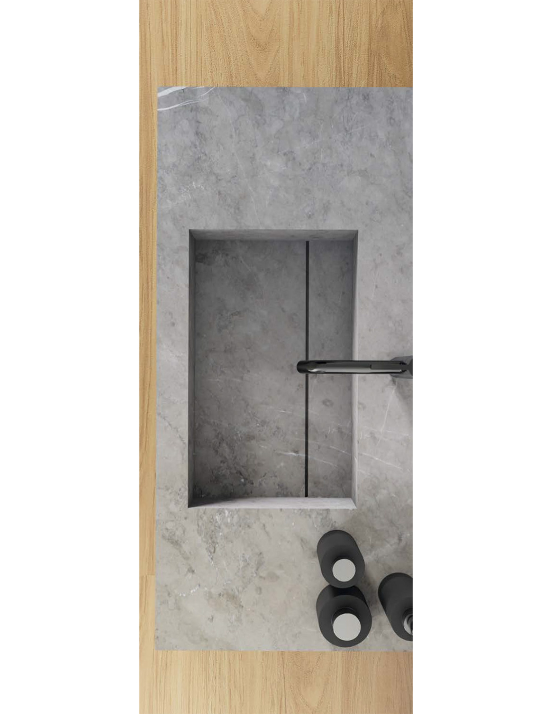 Madera Roble Nature. Lavabo Zero piedra gris. Espejo Roble Nature-Negro. Sistema apertura Gola Negro.