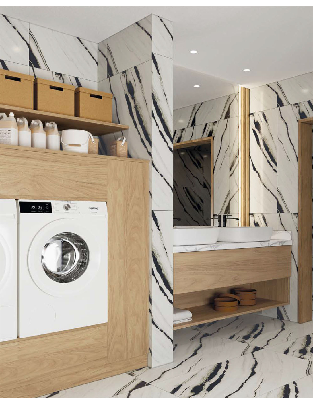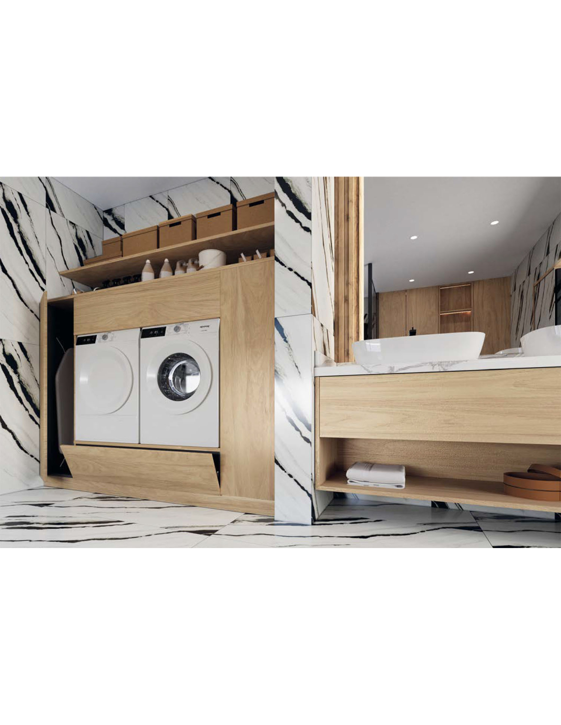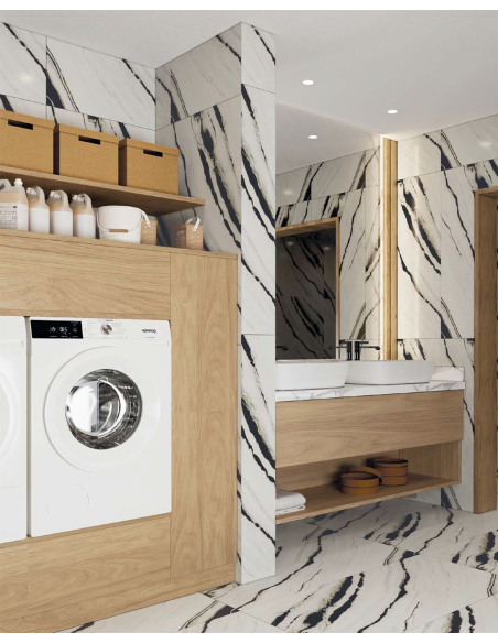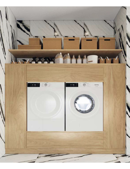 Composición Kosta para Lavandería con la posibilidad de hacerla a la medida que se necesite. Una manera elegante a la vez que práctica para la zona de lavado y planchado. Perfecta para poder guardar todo lo necesario y tener la estancia siempre recogida.