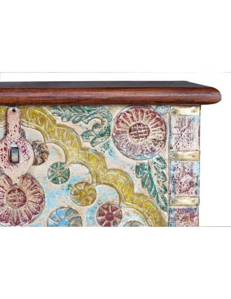 Sí estabas buscando una pieza fina y distinguida en donde pudieras almacenar tus objetos, te ofrecemos la solución perfecta con el baúl en madera mango estilo étnico, un mueble auxiliar con un diseño decorativo en colores con detalles en bronce sobre un fondo envejecido, muy al estilo vintage. Seduce con ambientes rústicos cada rincón de tu hogar. De patas altas para que le busques un nuevo lugar cuando lo decidas. Arriésgate y decora tu casa con mucho estilo.