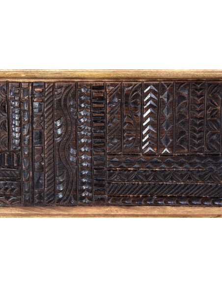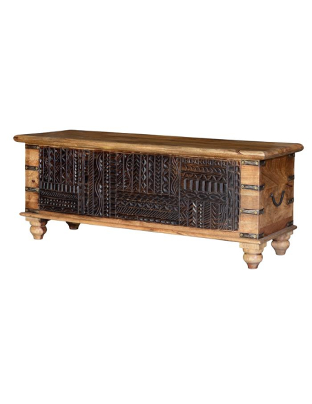 Sí estabas buscando una pieza fina y distinguida en donde pudieras almacenar tus objetos, te ofrecemos la solución perfecta con el baúl en madera mango con el frente tallado oscuro, un mueble auxiliar con un diseño decorativo en madera de mango color natural con el frente tallado en color oscuro, patas torneadas y detalle de forja en los laterales. Seduce con ambientes rústicos cada rincón de tu hogar. De patas altas para que le busques un nuevo lugar cuando lo decidas. Arriésgate y decora tu casa con mucho estilo.