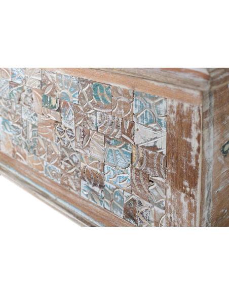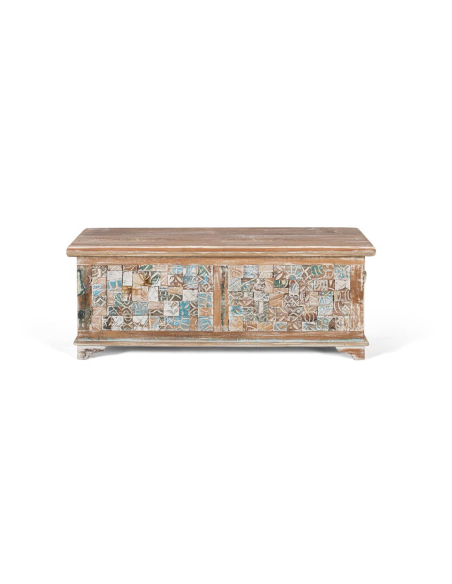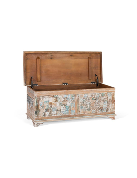 Sí estabas buscando una pieza fina y distinguida en donde pudieras almacenar tus objetos, te ofrecemos la solución perfecta con el baúl en madera mango y madera reciclada, un mueble auxiliar con un diseño decorativo en madera de mango color natural con el frente tallado combinando diferentes tonalidades y tapa en color más oscuro. Seduce con ambientes rústicos cada rincón de tu hogar. De patas altas para que le busques un nuevo lugar cuando lo decidas. Arriésgate y decora tu casa con mucho estilo.