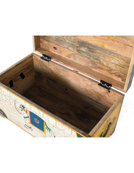 Baúl Liena pintado a mano elefante blanco, inspirado en los vibrantes paisajes y la rica historia de la India. Los elefantes majestuosos y las hojas exuberantes adornan la superficie, transportándote a un mundo de belleza y misterio. Construido con madera de alta calidad, este baúl no solo es una pieza de arte, sino también un práctico espacio de almacenamiento. Sus herrajes metálicos añaden un toque de rusticidad y durabilidad, mientras que su amplia capacidad de guardado te permite organizar y ocultar tus pertenencias con facilidad.