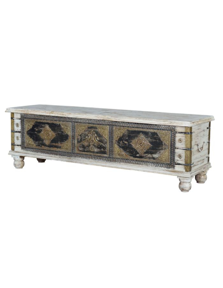 Apuesta por diseños exclusivos y de estilo antiguo con el baúl en madera mango estilo barroco, un mueble robusto por su madera de mango y de diseño de rombos con apliques de bronce. Ideal para que guardes viejos recuerdos. Lucirá de maravilla en tu dormitorio o en algún rincón de tu hogar que necesite un toque especial y único. Con patas de madera para una fácil limpieza del suelo. Siéntete exclusivo con accesorios originales y de última tendencia.
