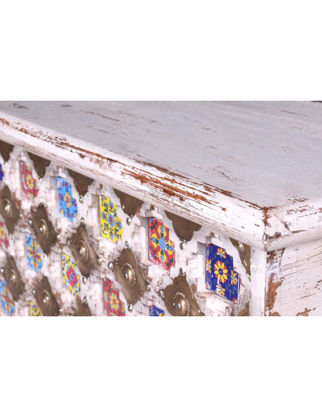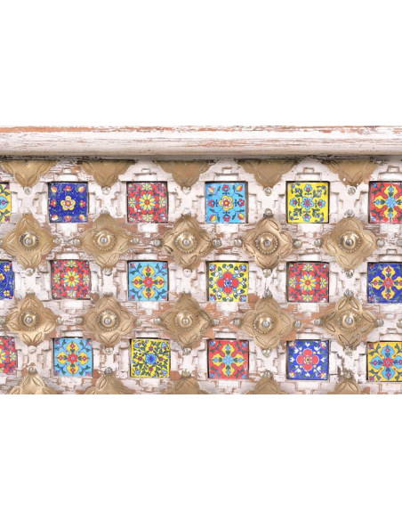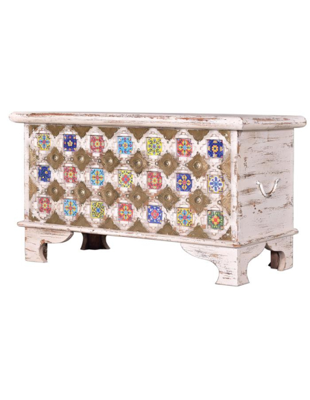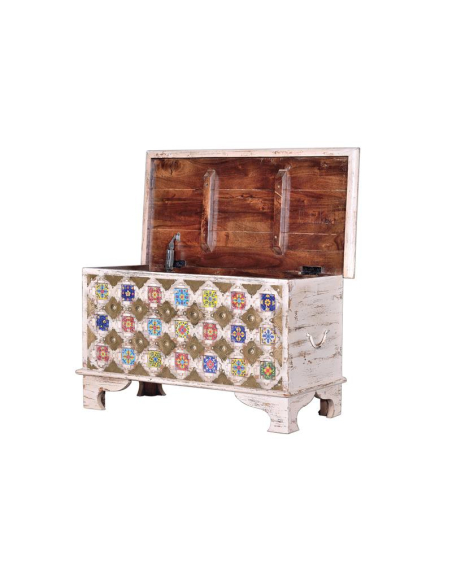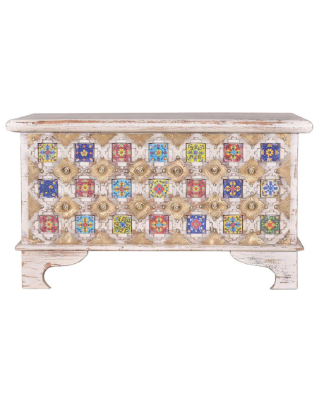 Te presentamos el arcón en madera de mango natural efecto decapé un mueble auxiliar muy original y único por sus diseños florales en cerámica y latón, una combinación exquisita entre tonos pasteles para hacer de tus espacios los mejores que apoyan las últimas tendencias vintage y chic. De apariencia envejecida por su efecto decapé. Una pieza funcional, práctica y hermosa. Inclusive puedes usarla como accesorio decorativo para cualquier rincón de tu hogar, puedes usar tu imaginación para darle un tono muy chic, puedes colocar revistas o tus libros preferidos. No te quedes sin la tuya.