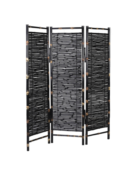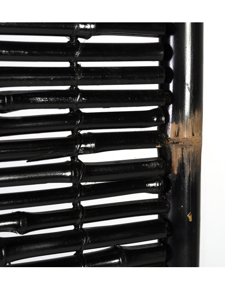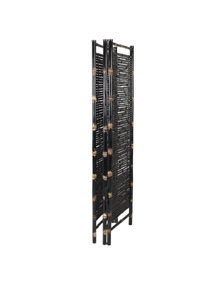 Biombo bambú negro, aporta un toque natural y elegante a cualquier espacio, combinando funcionalidad con un diseño exótico. La estructura de bambú, resistente y ligera, soporta paneles rectangulares cubiertos por pequeñas barras de bambú dispuestas horizontalmente, lo que le otorga un aire rústico y armonioso. Ideal para dividir espacios de manera sutil o como pieza decorativa, su estilo versátil se adapta tanto a ambientes modernos como más tradicionales. Perfecto para salones, dormitorios o zonas de transición, este biombo es la opción ideal para quienes buscan una solución decorativa y funcional con un toque natural.