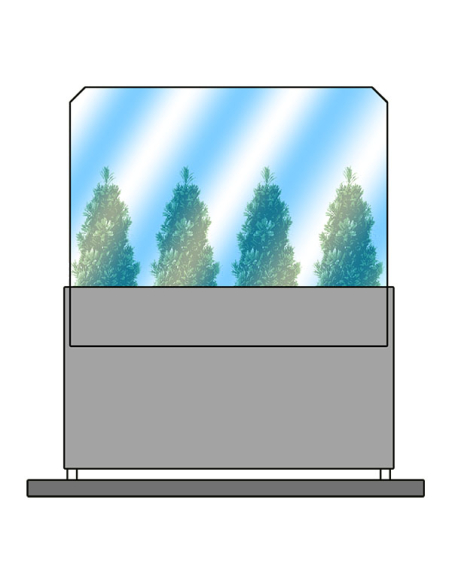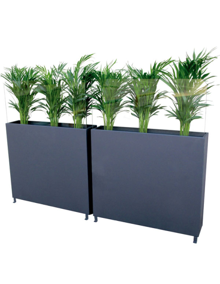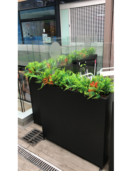 Jardinera de hierro separadora de espacios. Con o sin cristal. Con 38 kg de peso, de estética cuidada y diseño pulido. Con desagüe.